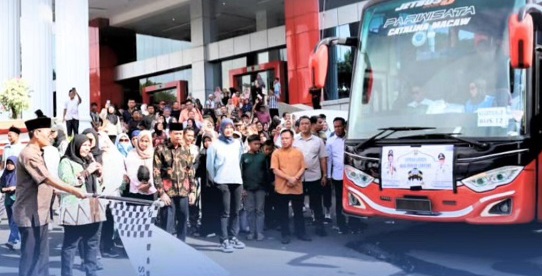 Sebagai bentuk perhatian dan kedekatan, Wali Kota Eva Dwiana turut menaiki bus jamaah untuk menyapa langsung para calon tamu Allah sebelum mereka berangkat.