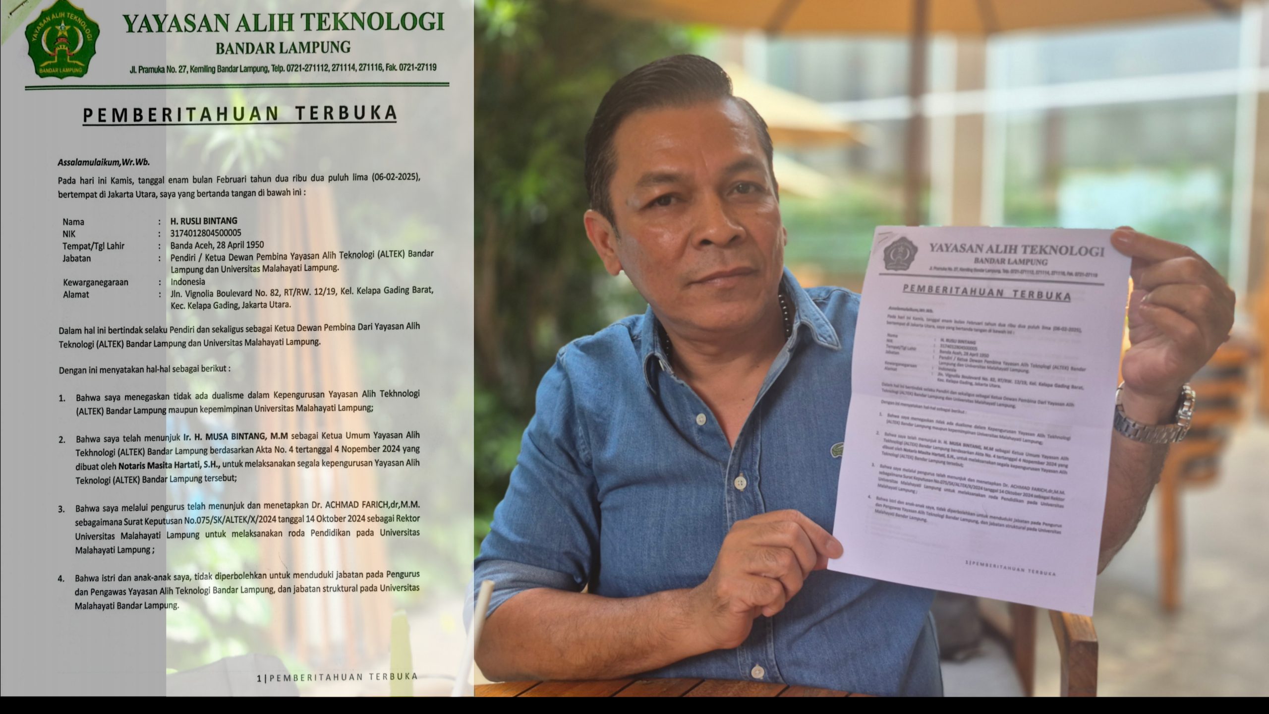 Dr (HC) H.Rusli Bintang Tegaskan Tak Ada Dualisme di Yayasan Altek Bandar Lampung dan Universitas Malahayati Bandar Lampung.