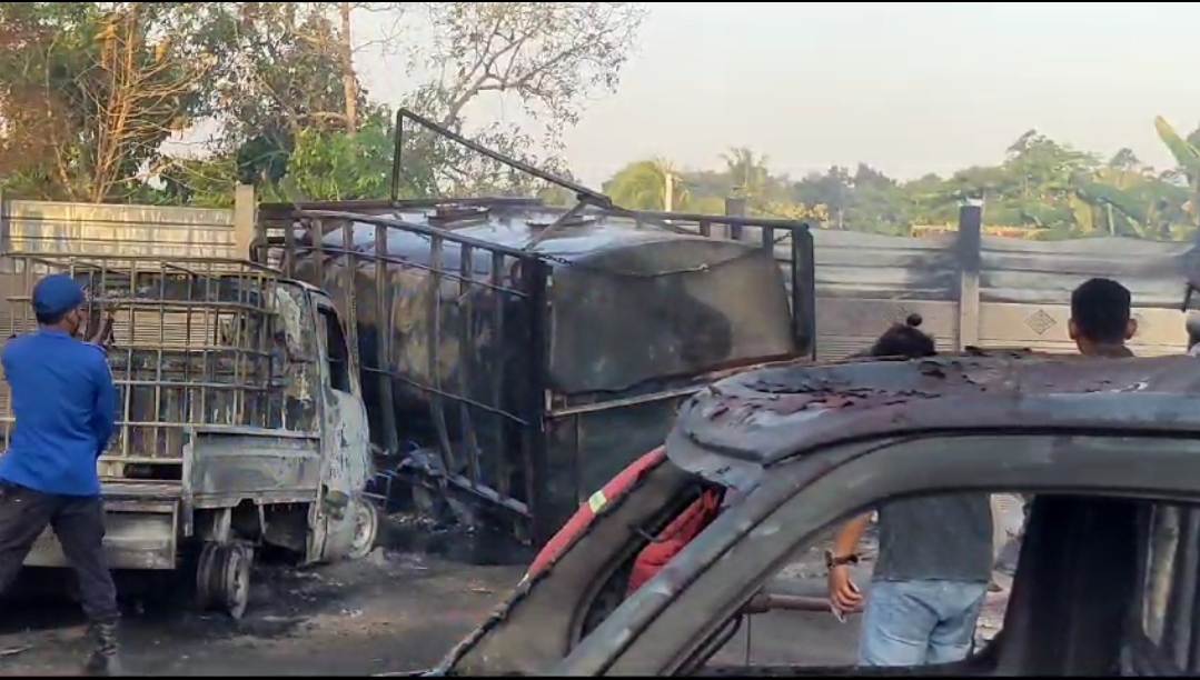 Selain truk tersebut, tampak juga dua mobil pick up serta satu unit motor hangus terbakar. Dilokasi itu juga ditemukan 17 tandon yang juga terbakar menyisakan kerangka besi nya.(Rvis)